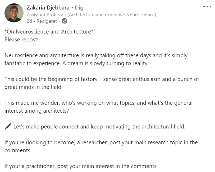 Knowledge has long been primarily shared through lectures, books, and articles. Today, knowledge is shared and gathered largely through social media. This is surely not true for fields. However, from one of my LinkedIn posts, it’s clear that the interdisciplinary field of neuroscience and architecture has a vibrant social media profile. Over 2 days, the post gathered >150 comments expressing either interest or current work from researchers, advisors, and scientists! There were numerous young bright minds aspiring to become researchers too.